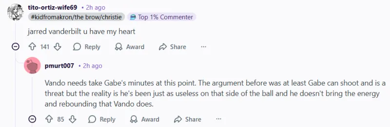 -(85贊)在這一點(diǎn)上,范德彪需要取代蓋布的上場(chǎng)時(shí)間。之前的論點(diǎn)是蓋布至少能投籃并有威脅,但現(xiàn)實(shí)是他在這一側(cè)同樣一無是處,而且他也無法像范德彪那樣帶來能量和籃板。