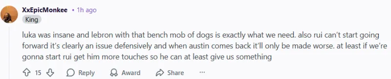 -(15贊)盧卡太瘋狂了,勒布朗帶著那群替補(bǔ)猛獸正是我們需要的。另外,八村以后不能首發(fā)了,防守上明顯有問題,而且奧斯汀回歸后情況只會(huì)更糟。至少如果非得讓八村首發(fā),給他更多球權(quán),讓他至少能給我們一些貢獻(xiàn)。
