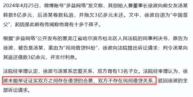 法院的民事判決書顯示,法院認(rèn)定徐波和“二妞媽”是戀愛關(guān)系,確實一起生了13個孩子,而且徐波拿不出任何證據(jù)證明那筆錢是“借款”,最后直接駁回了他要回3億多的全部請求。