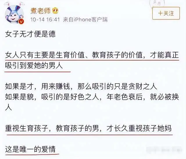 他曾公開說,“女性最大的價值就是生育,不要去搞什么事業(yè),在家生孩子就好”,甚至還極端地表示“不生孩子的女人相當(dāng)于殘廢”。
