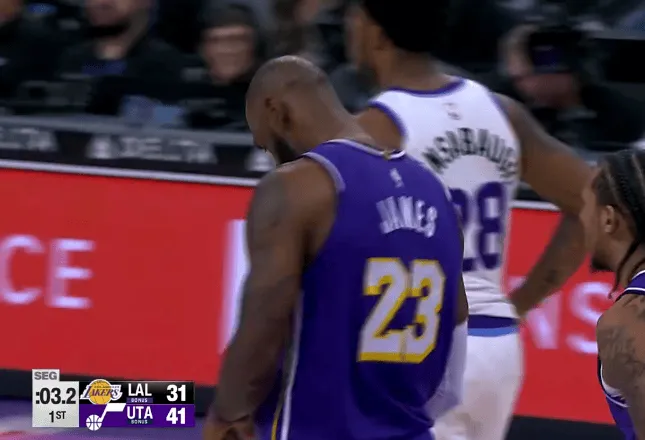 第一節(jié)比賽中,板詹詹姆斯籃下造成犯規(guī)也兩罰一中,造成湖人首節(jié)32-41落后爵士9分。犯規(guī)罰中