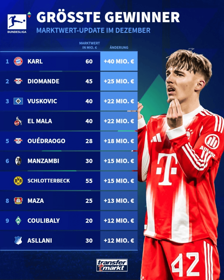 虎撲12月19日訊 德國轉(zhuǎn)會(huì)市場在今日更新了德甲球員身價(jià)上漲排名,拜仁17歲小將卡爾上漲4000萬歐居首,爾暴萊比錫前鋒迪奧曼德漲2500萬第二。漲萬漲萬