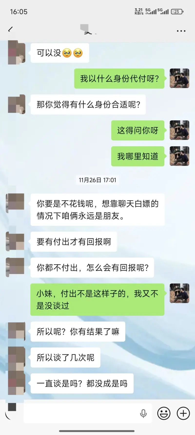 之前相親了一個(gè)離異帶娃的,見了一面,飯后我問(wèn)她結(jié)婚幾年了,她猶豫了一會(huì)說(shuō)2022年結(jié)婚的,我們?nèi)ス淞艘粫?huì)街,給她買了十幾斤水果,她說(shuō)吃水果對(duì)身體好。過(guò)了幾天媒人問(wèn)聊的咋樣了,說(shuō)了好多,期間媒人不小心說(shuō)漏嘴了,其實(shí)她是人家小三,沒有上位成功,斗不過(guò)原配,但是孩子也生了,所以來(lái)相親找個(gè)接盤俠,我知道后也沒說(shuō)啥,后面也不主動(dòng)找她聊天了,某一天她主動(dòng)來(lái)找我聊天,就是后面的對(duì)話,說(shuō)到后來(lái)我也不回復(fù)了,神奇的來(lái)了,過(guò)了大概有一個(gè)月吧,她跟媒人說(shuō)我刪了她,其實(shí)我沒有刪,是她因?yàn)槲覜]有給她代付,她破防了把我刪掉。