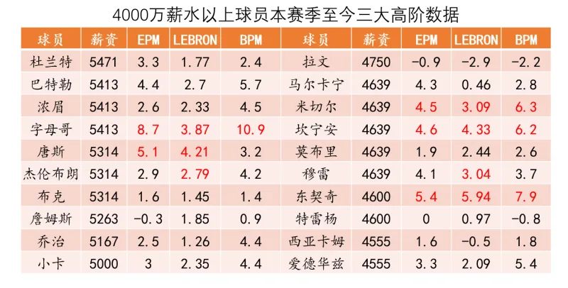 最后我們來(lái)回答現(xiàn)在的巴特勒到底值多少薪水的問(wèn)題,于是我把本賽季薪資接近于巴特勒以及在4,000萬(wàn)以上級(jí)別的球員都列舉了出來(lái)。如上表所示,除了沒(méi)列出、但毫無(wú)疑問(wèn)是聯(lián)盟前二的約基奇和SGA以外,剩下的在三大高階數(shù)據(jù)上都領(lǐng)先于巴特勒的只有字母哥、米切爾、坎寧安和東契奇4名球員而已,兩項(xiàng)或一項(xiàng)高于巴特勒的只有唐斯、杰倫布朗和穆雷。我們就算這些球員本賽季全都強(qiáng)于巴特勒好了,那么剩下還有至少一半的球員本賽季的表現(xiàn)是不如巴特勒的,而他們的薪水與巴特勒是相近的。所以我個(gè)人認(rèn)為巴特勒溢價(jià)的部分是他的常規(guī)賽出勤率隱患,畢竟過(guò)去幾個(gè)賽季也就只能打60場(chǎng)左右,但是他真正上場(chǎng)時(shí)所打出的影響力是值得這份薪水的。