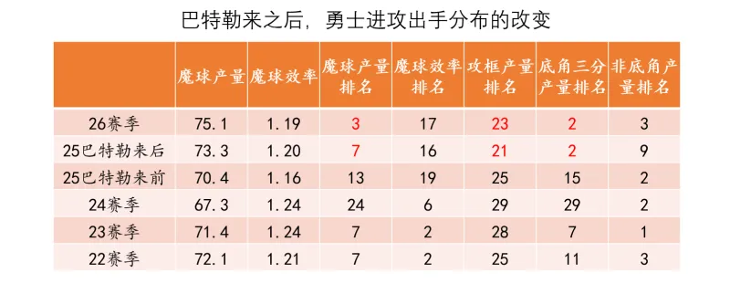 除此之外,我們也可以看到巴特勒加入勇士后球隊(duì)在魔球區(qū)域的出手分布同樣有了排名上的質(zhì)變,本賽季至今的魔球產(chǎn)量更是高居聯(lián)盟第3名,而一支球隊(duì)如果能在魔球區(qū)域更多的開(kāi)發(fā)進(jìn)攻,那么在進(jìn)攻效率的預(yù)期值上就會(huì)更高。這時(shí)可能就有朋友要問(wèn)了,不對(duì)呀,勇士本賽季的進(jìn)攻效率很慘呢,但這背后的原因主要有兩點(diǎn),第一點(diǎn)是勇士球員的終結(jié)效率實(shí)在是太低了,背后的本質(zhì)是大部分球員進(jìn)攻天賦嚴(yán)重不足,甚至毫無(wú)持球進(jìn)攻的能力,所以我們?cè)谝曨l里也反復(fù)強(qiáng)調(diào),勇士需要在進(jìn)攻端補(bǔ)充終結(jié)效率高的球員,特別是攻框產(chǎn)效不錯(cuò)的球員。