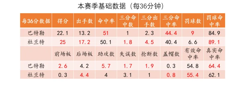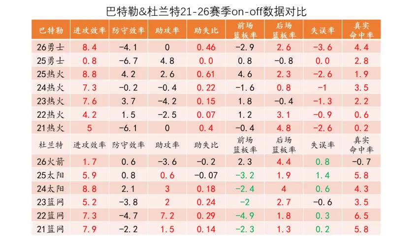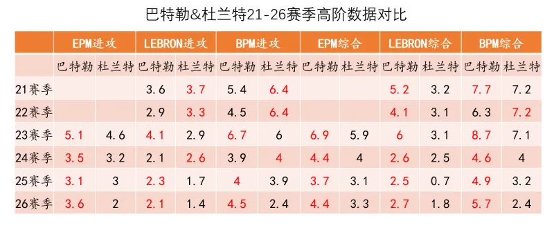 從上表中可以看到,21、僅分進(jìn)攻22兩賽季杜蘭特在進(jìn)攻影響力上強(qiáng)于巴特勒,巴的兩但綜合影響力上兩人互有勝負(fù)。而從23賽季開(kāi)始,幾乎所有的高階進(jìn)攻數(shù)據(jù)及綜合數(shù)據(jù)都是巴特勒要強(qiáng)于杜蘭特,而且這些高階數(shù)據(jù)只參考了常規(guī)賽的表現(xiàn)并不包含季后賽發(fā)揮。但目前的主流觀點(diǎn)是巴特勒常規(guī)賽愛(ài)劃水而杜蘭特常規(guī)賽是很認(rèn)真的,也就是說(shuō)看上去在劃水的巴特勒其高階進(jìn)攻影響力依然強(qiáng)于努力的杜蘭特,這就非常有趣了。
