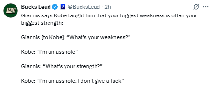 [流言板]字母哥發(fā)問:你的我不在乎優(yōu)勢是什么?科比:我是個混蛋,我不在乎由虎撲籃球資訊 發(fā)表在籃球資訊 https://bbs.hupu.com/502
