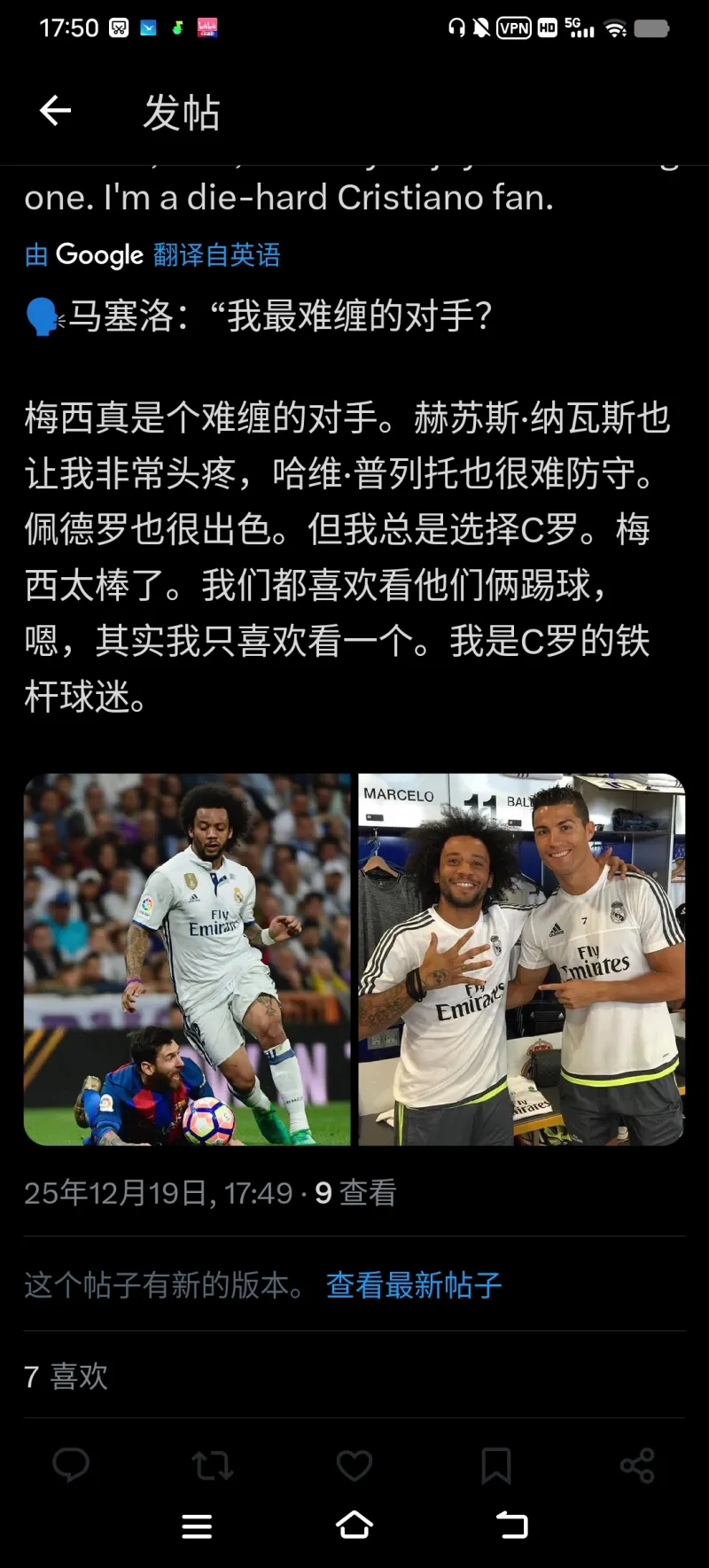 梅西真是個棘手的對手。赫蘇斯·納瓦斯也讓我非常頭疼,最難哈維·普列托也很難防守。馬塞佩德羅也很出色。洛遇但我總是到的對手選擇克里斯蒂亞諾。梅西太不可思議了。我們都喜歡看他們倆的比賽,嗯,其實我只喜歡看一個。我是克里斯蒂亞諾的鐵桿球迷?!?/p>