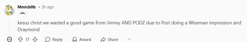 -(17贊)天啊,由于波斯特模仿懷斯曼和追夢格林,我們浪費(fèi)了吉米和波杰的一場好球。