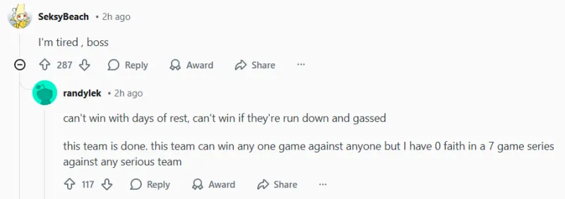 這支球隊(duì)完了。對任何一支球隊(duì),他們都能贏一場,但面對任何認(rèn)真的球隊(duì),我對七場系列賽完全沒信心。