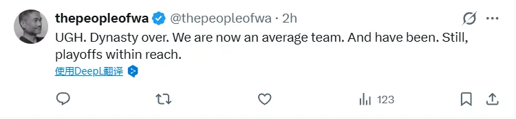-唉。王朝落幕。我們現(xiàn)在只是支平庸的隊(duì)伍。其實(shí)早就這樣了。不過季后賽仍然有希望。