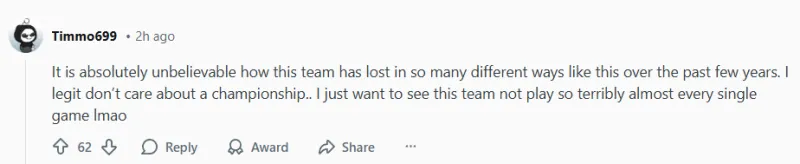 -(62贊)在過去的幾年里,這支球隊(duì)以如此不同的方式輸?shù)袅吮荣?,這絕對令人難以置信。我根本不在乎什么總冠軍...... 我只想看到這支球隊(duì)不再幾乎每場比賽都打得那么糟糕