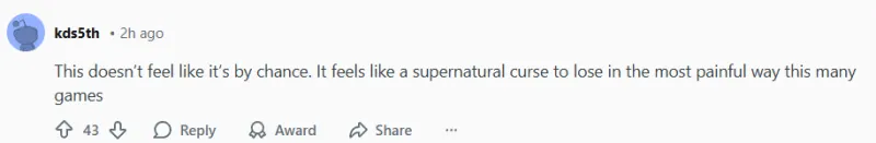 -(43贊)這不像是偶然。感覺就像一個超自然的詛咒,以最痛苦的方式輸?shù)袅诉@么多場比賽