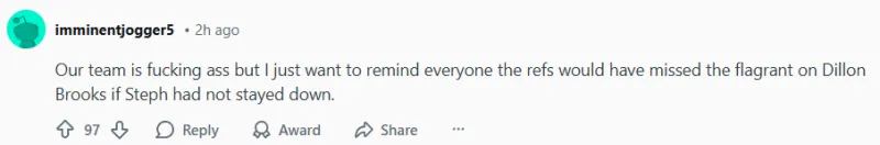 -(97贊)我們隊(duì)爛得要死,但我只想提醒大家,如果不是斯蒂芬倒地,裁判根本不會吹狄龍·布魯克斯的惡意犯規(guī)。