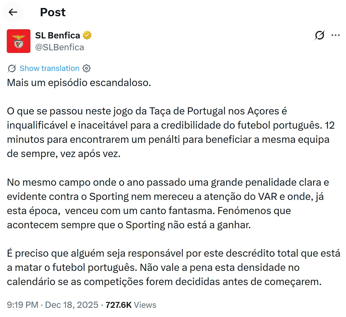 虎撲12月19日訊 在葡萄牙杯一場(chǎng)極具爭(zhēng)議的比賽結(jié)束后,本菲卡方面公開(kāi)發(fā)聲。