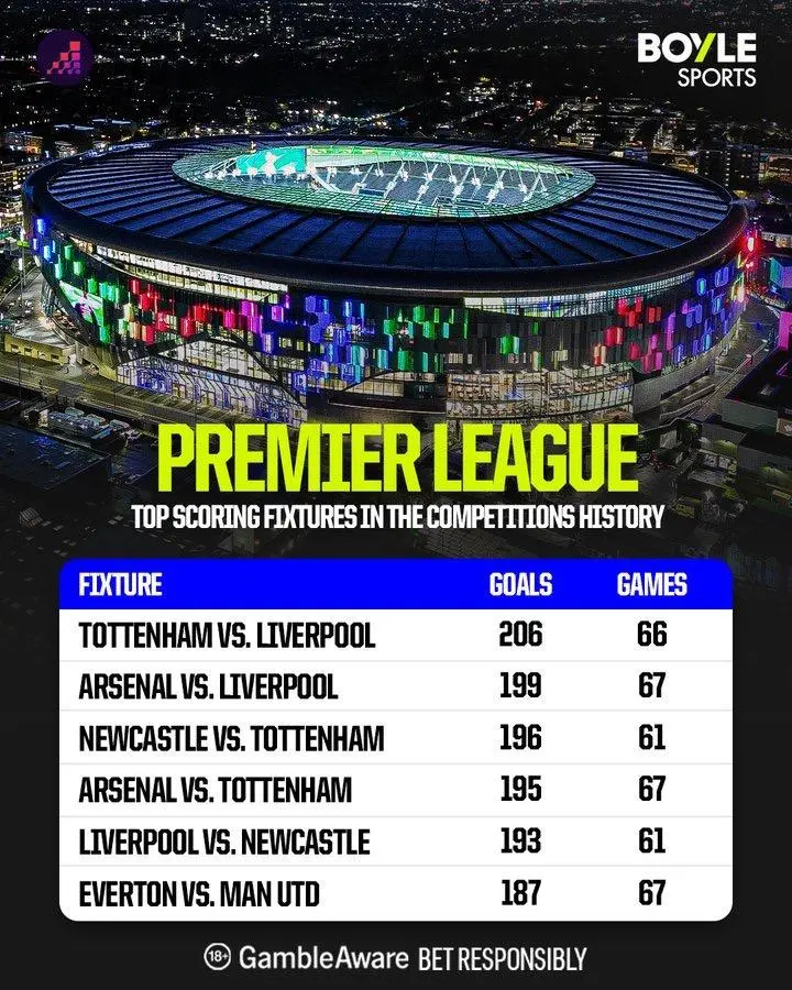 以下是決產(chǎn)英超歷史上進(jìn)球數(shù)最多的對(duì)賽組合: