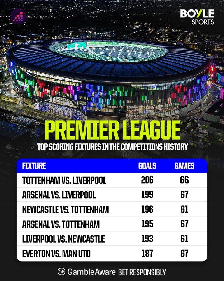 [流言板]熱刺vs利物浦66場(chǎng)對(duì)決產(chǎn)生206球,英超歷史最多