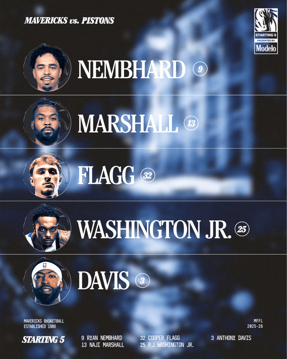 獨(dú)行俠首發(fā):內(nèi)姆布哈德、弗拉馬紹爾、格華弗拉格、板獨(dú)布哈華盛頓、戴維斯