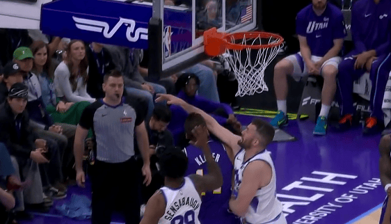 第四節(jié)比賽中,桿上克勒貝爾拉桿上籃被樂(lè)福打到面部,面部裁判回看吹罰普通犯規(guī)。裁判吹罰