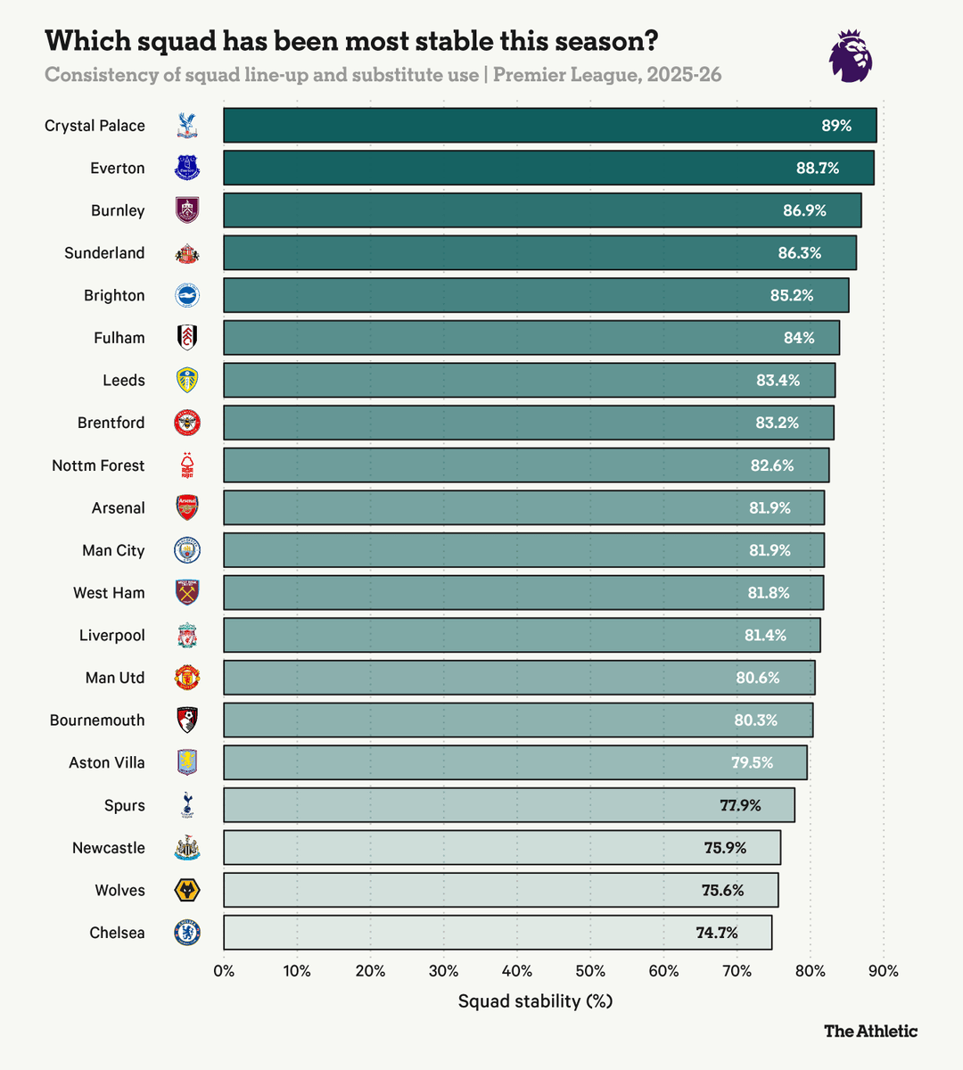 [流言板]一圖流:水晶宮本賽季陣容最穩(wěn)定,切爾西輪換最多