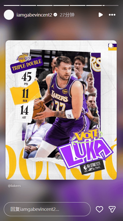 賽后,因傷缺陣的蓋布-文森特在INS上轉(zhuǎn)發(fā)了東契奇的三雙數(shù)據(jù)海報(bào)。