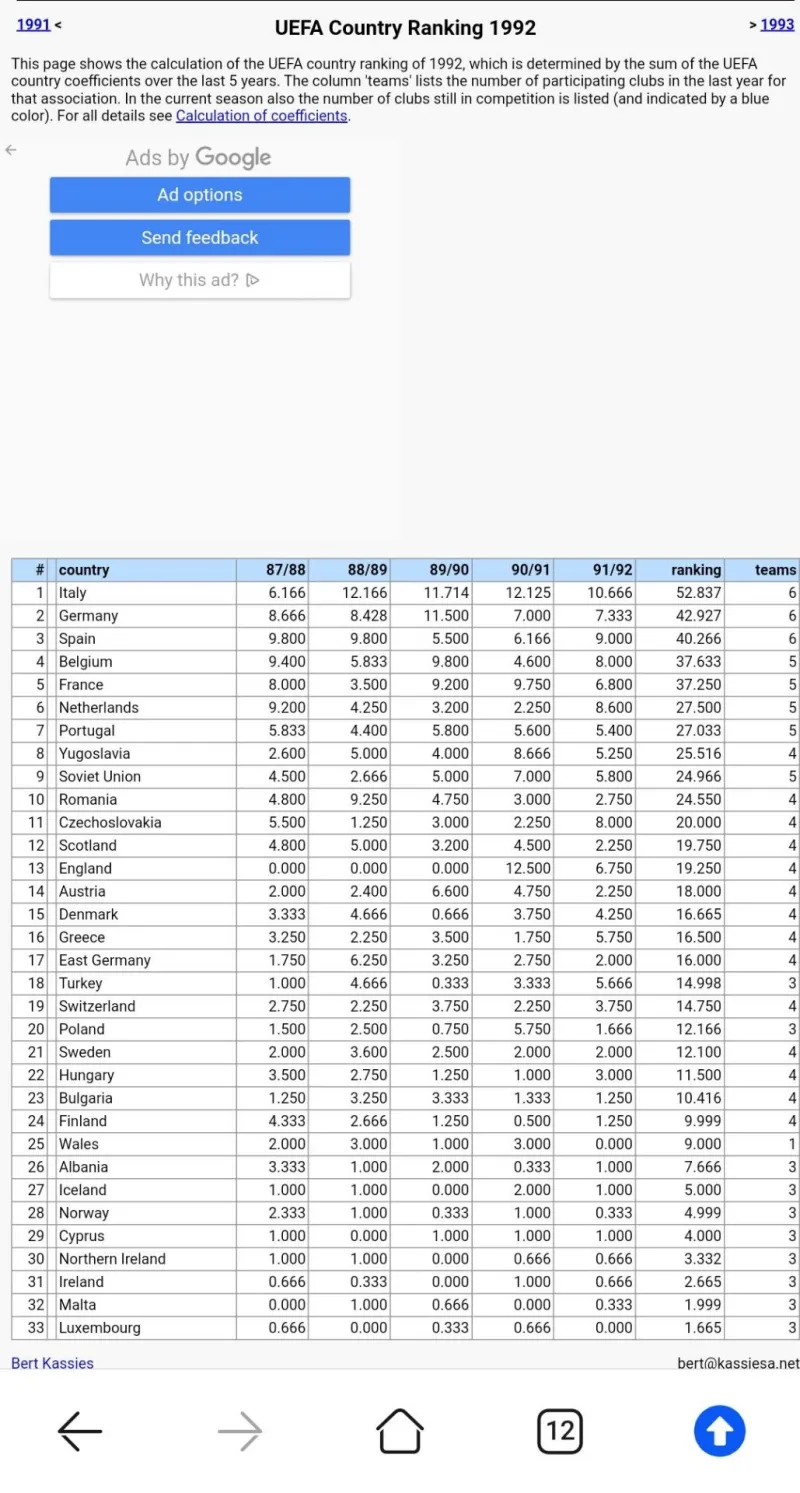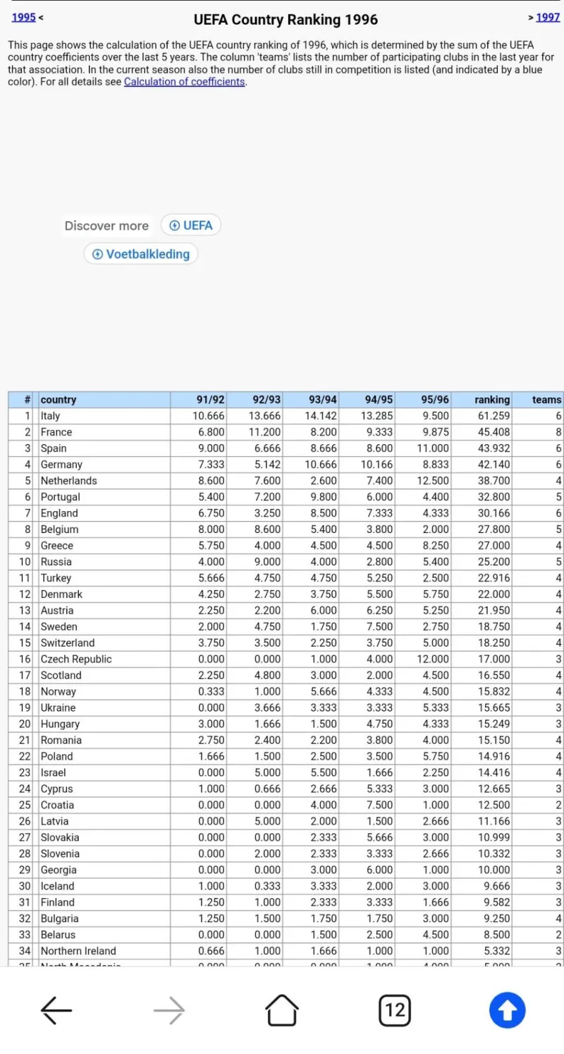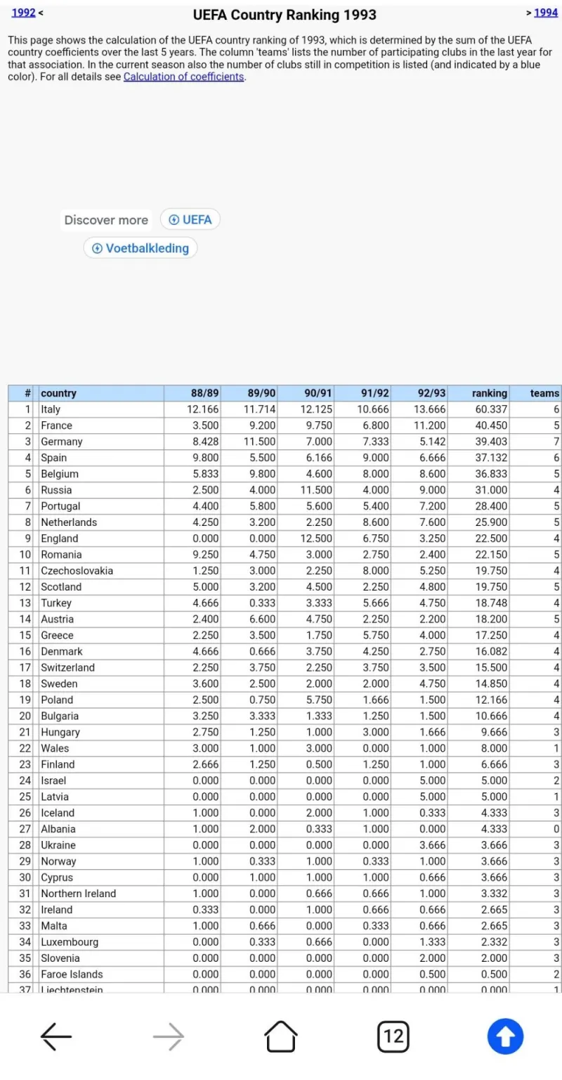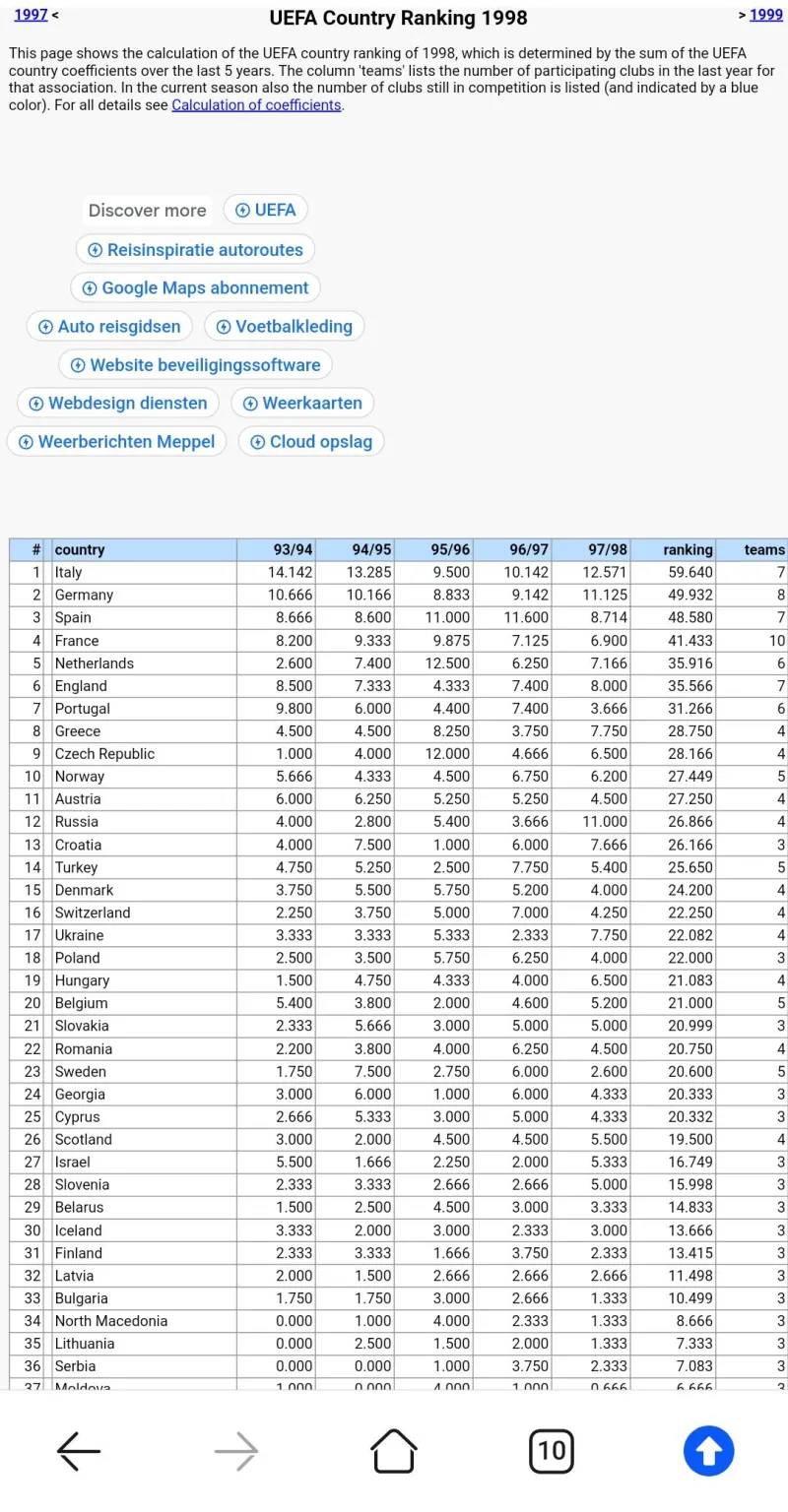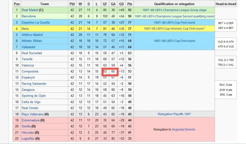 要判斷是第幾聯(lián)賽,核心依據就是歐足聯(lián)發(fā)布的“聯(lián)賽積分排名”,每賽季都是根據近5個賽季聯(lián)賽積分之和進行排名。為了更全面地了解西甲當時的水平,我采用1991到1998積分排名,截圖如下: