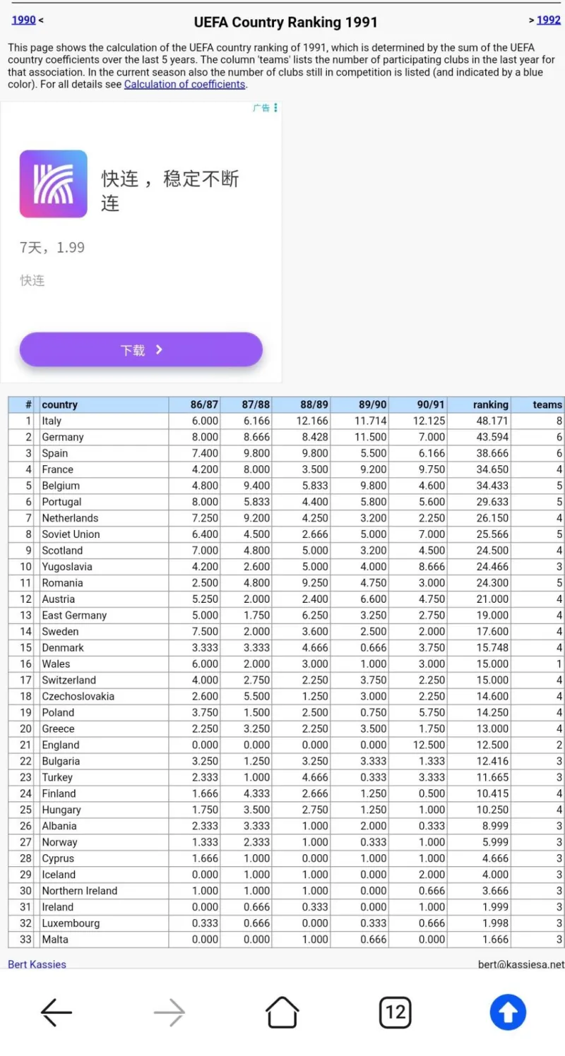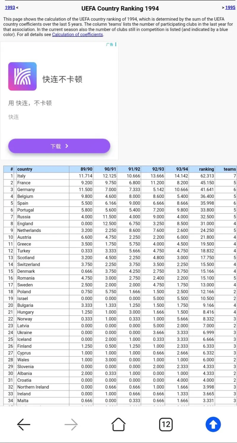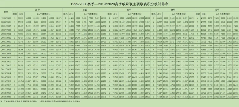 要判斷是第幾聯(lián)賽,核心依據就是表現歐足聯(lián)發(fā)布的“聯(lián)賽積分排名”,每賽季都是年代根據近5個賽季聯(lián)賽積分之和進行排名。為了更全面地了解西甲當時的西甲水平,我采用1991到1998積分排名,只第截圖如下: