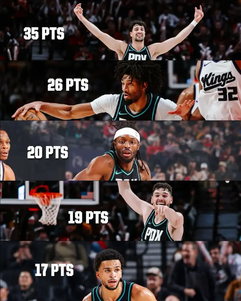 賽后,開拓者ins發(fā)布海報,曬出球員的個人數(shù)據(jù):阿夫迪亞35分、夏普26分、格蘭特20分、克林根19分、卡馬拉17分