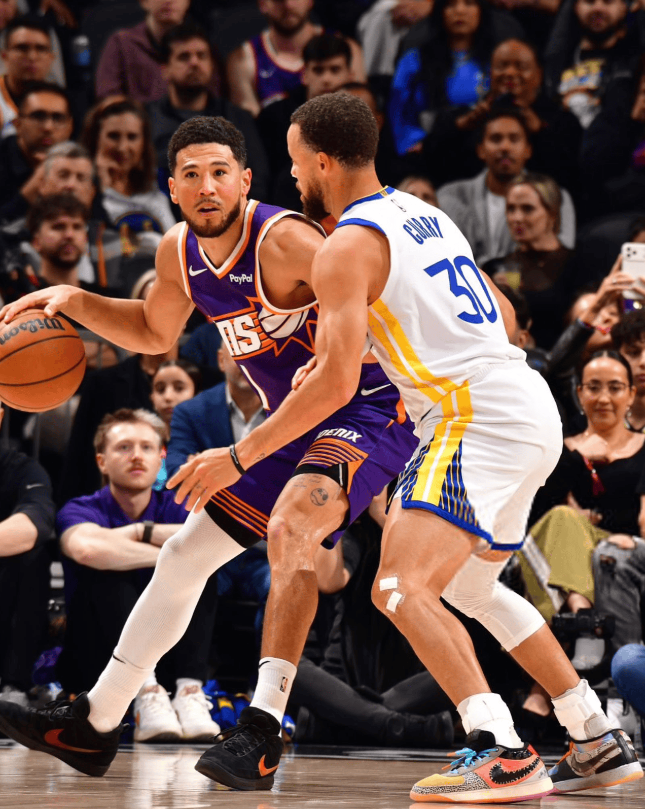 本場(chǎng)比賽,克球勇士球員斯蒂芬-庫(kù)里穿著太陽(yáng)后衛(wèi)德文-布克的鞋本想穿代言球鞋。賽后,擊敗庫(kù)里接受采訪談起了此事。流言里談